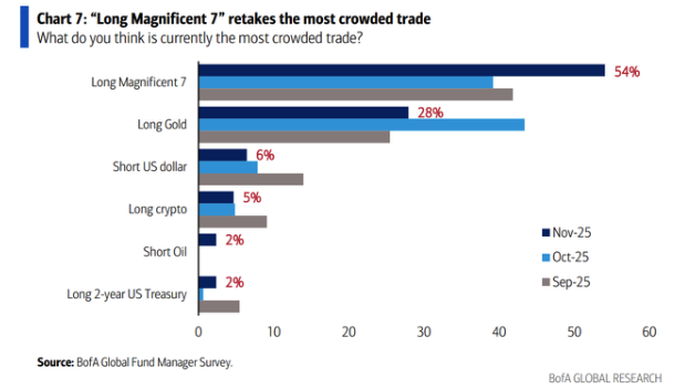 在本月的FMS报告中,有54%的基金经理将“做多7巨头”列为最拥挤的交易,高于10月不到40%的比例,当时“做多黄金”被评为最拥挤交易。在本次调查中,“做多黄金”只拿到28%的投票,低于10月的43%。
