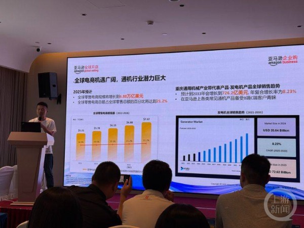 亚马逊数据显示,重庆通用机械产业带代表产品发电机产品预计到2033年会增长到726.2亿美元,年复合增长率为8.23%。“重庆通用机械产业出海仍有很大潜力。”亚马逊企业购中国新卖家业务负责人狄庆庆谈道。