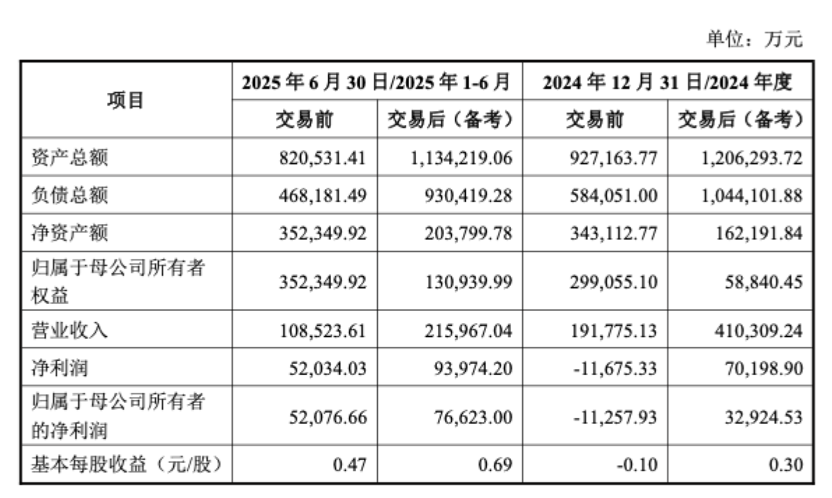 2024年度及2025年上半年,交易前上市公司营业收入分别为19.18亿元、10.85亿元,交易后备考营业收入分别达41.03亿元、21.6亿元,增长翻倍;归母净利润2024年从亏损1.13亿元扭转为盈利3.29亿元,2025年上半年从5.21亿元增至7.66亿元,显著增强上市公司盈利能力和持续经营能力。